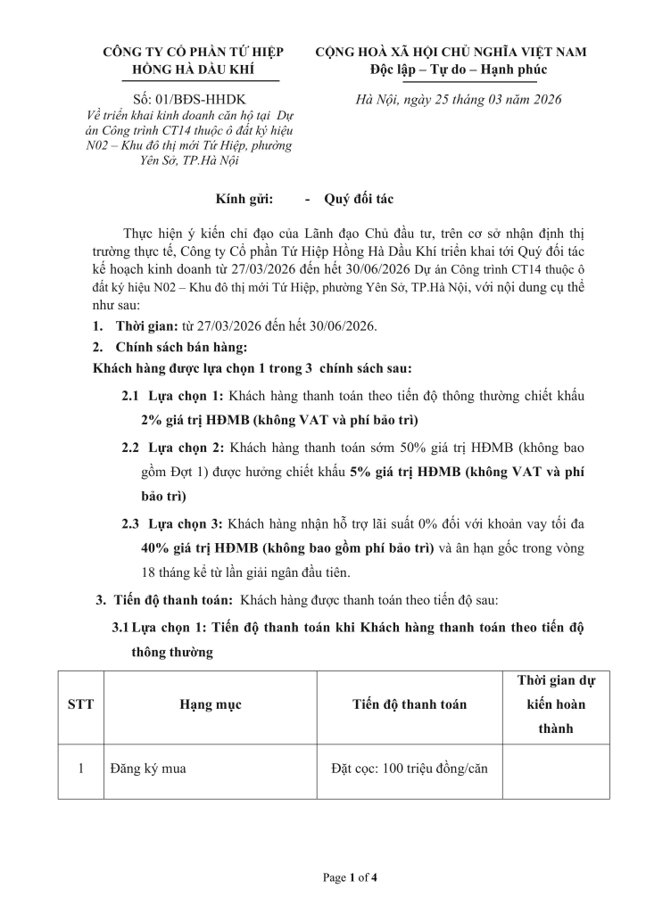 Lựa chọn 1: Khách hàng thanh toán theo tiến độ thông thường chiết khấu 2% giá trị HĐMB (không VAT và phí bảo trì)