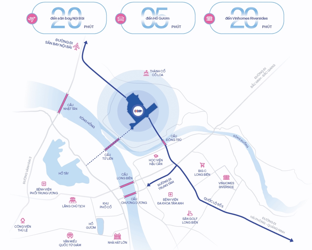 - Kết nối nhanh chóng tới sân bay Quốc tế Nội Bài, trung tâm Hà Nội và vùng kinh tế trọng điểm miền Bắc: Hải Phòng, Quảng Ninh, Bắc Ninh, Bắc Giang, Thái Nguyên