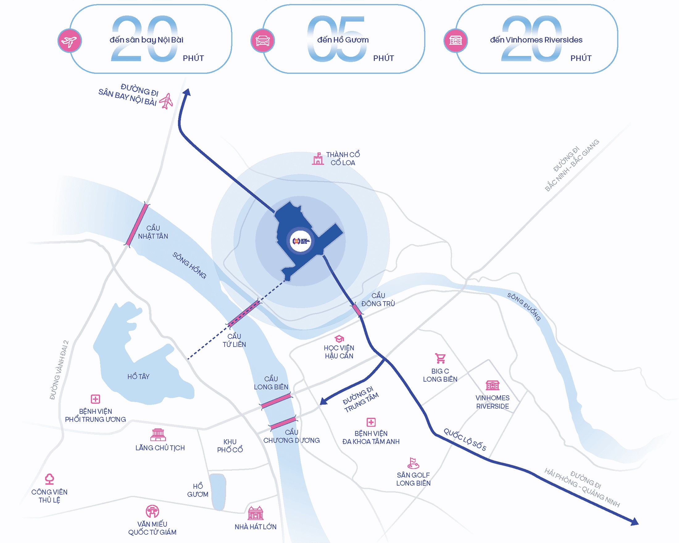 Nằm trên trục đường Trường Sa (Quốc lộ 5), Vinhomes Global Gate là tâm điểm phía Đông Bắc, liền kề lõi trung tâm Thủ đô. Vị trí này cho phép cư dân dễ dàng kết nối nhanh chóng tới sân bay Quốc tế Nội Bài, trung tâm Hà Nội và các tỉnh thuộc vùng kinh tế trọng điểm phía Bắc như Hải Phòng, Quảng Ninh, Bắc Ninh, Bắc Giang, Thái Nguyên.